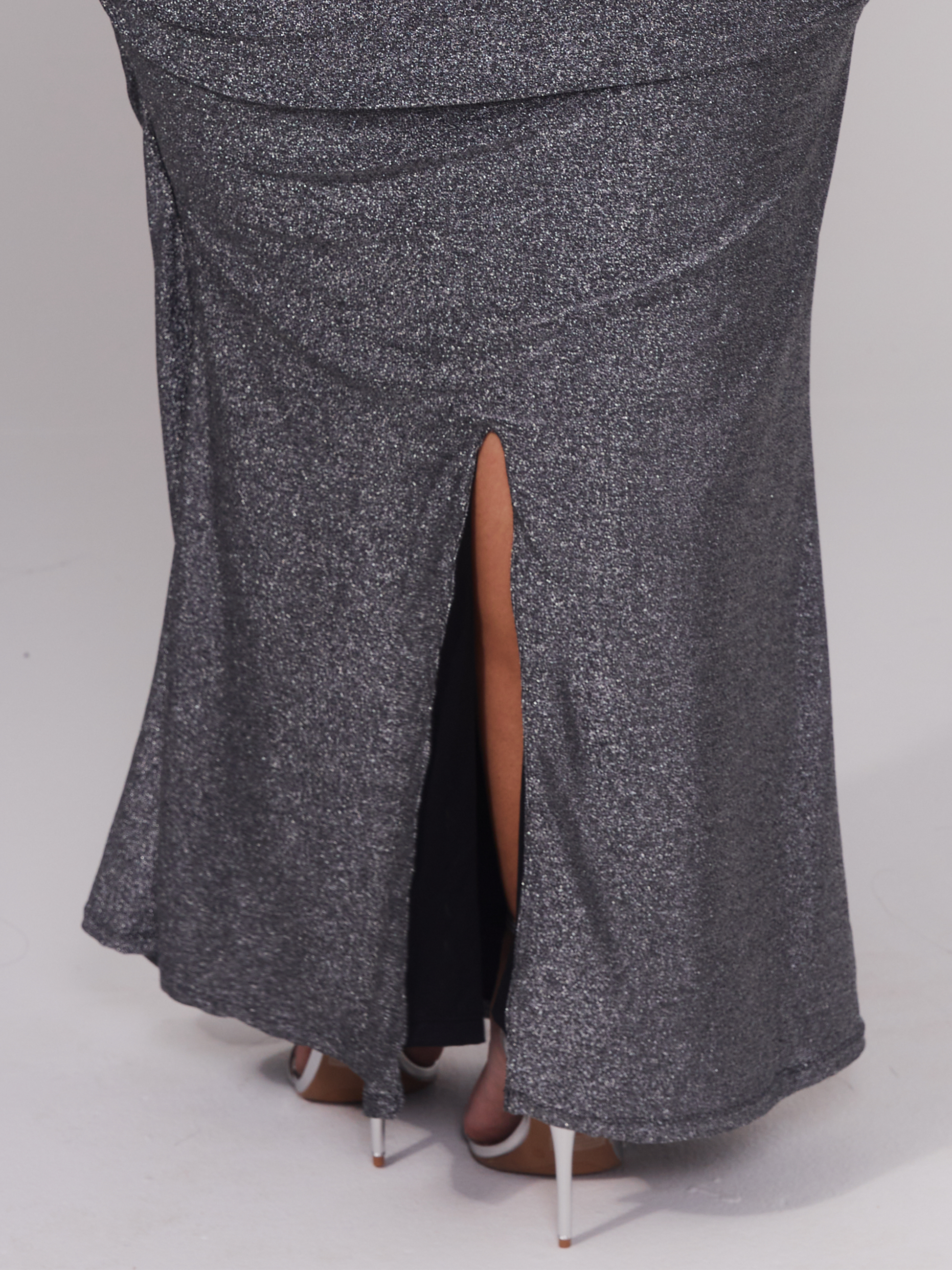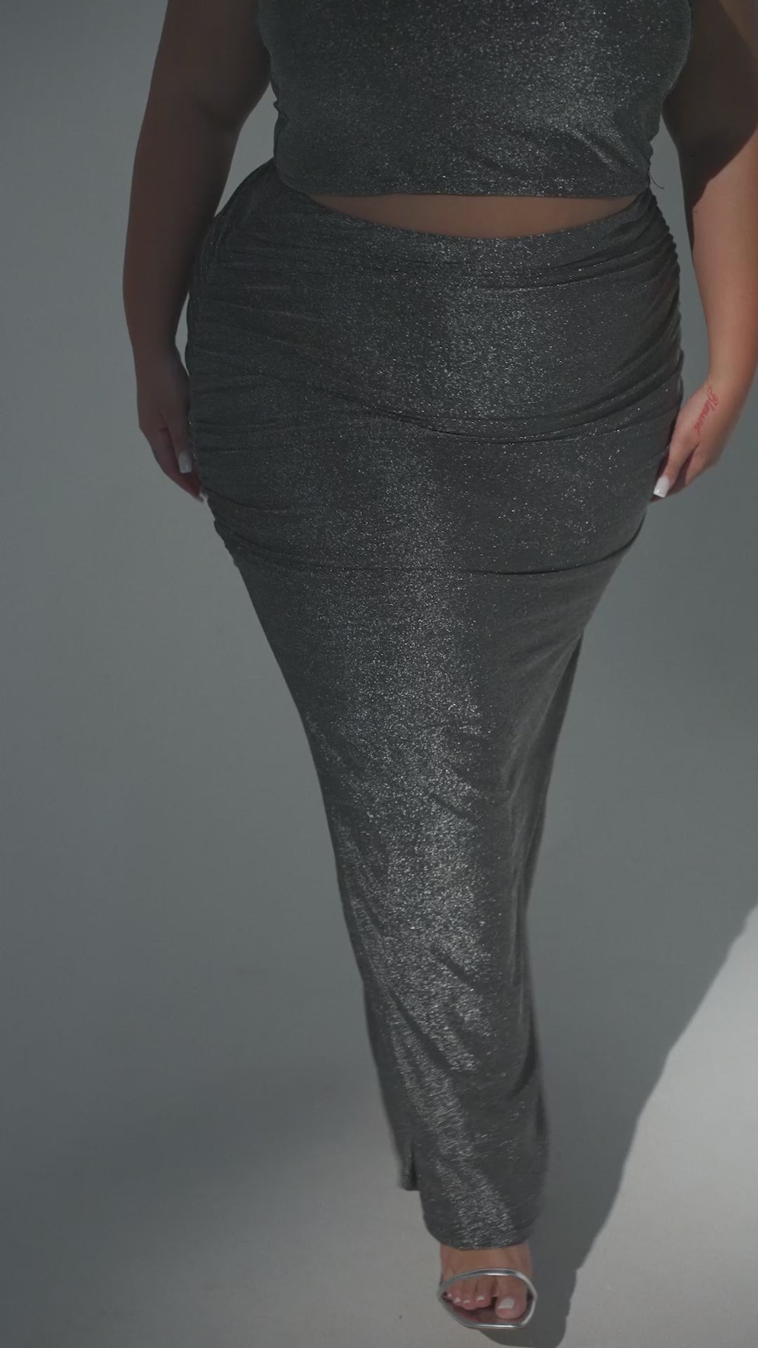 Embrace the spotlight at every event with our Limited Edition Shimmer Maxi Skirt. Designed with our Shimmer fabric blend and ruched detailing on both sides, this sparkly maxi skirt can be worn both high waisted or low waisted and is complete with a flirty slit on the back. Pair with our matching Shimmer One Shoulder Brami for a complete look!