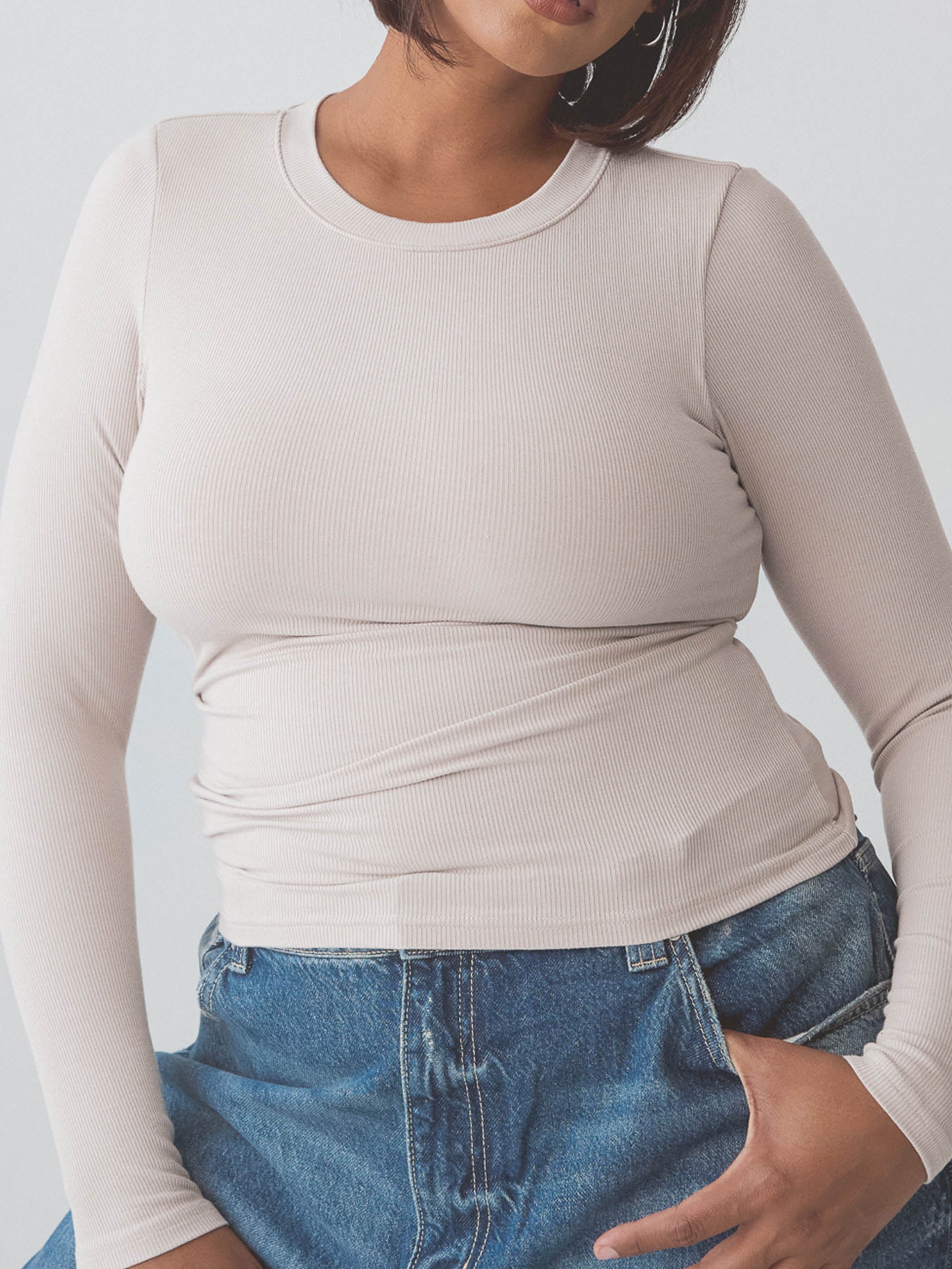 A classic style that is a must have in every closet! Our Ribbed Crew Neck Long Sleeve is a thinly ribbed long sleeve crew neck style with built-in padding and a light compressive band for extra support. Dress it up or down with no bra needed.