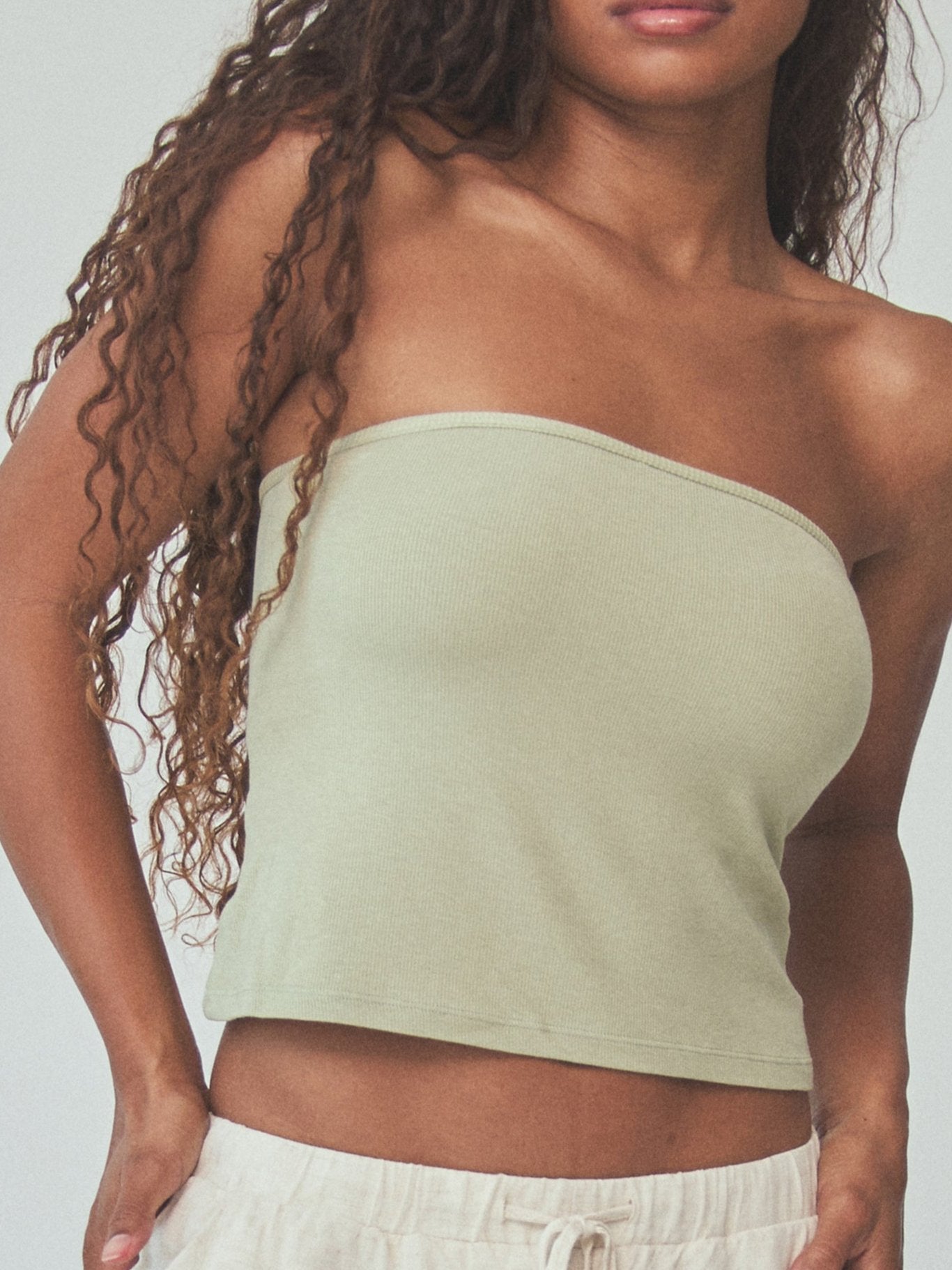 - Details: Strapless, mid-length, ribbed fabric, built-in removable padding